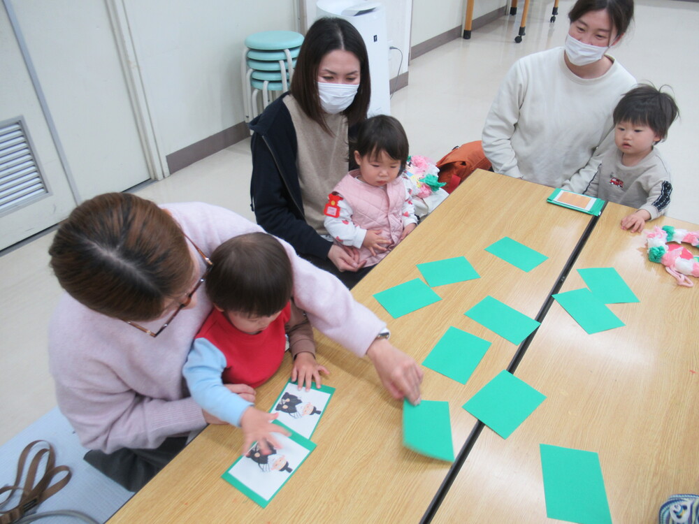 その後はおひな様に関係する絵柄の神経衰弱ゲーム!ルールがあるので少し難しいかなと思い挑戦したのですが、意外にも大盛り上がりで、子どもたちもやっていくうちに、2枚めくっていいことや同じ絵柄が出たら良いことなどが分かり出し、楽しんでくれていました。