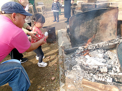 危ないって言われても、火の回りにみんな集まって暖をとったり、ぱちぱちと火を眺めたり木を投げ込んだりと、焚き木にも興味津々。葉っぱをあつめて遊んだり、その葉っぱを火に向かって投げ込んだりと、待っている間もいろいろ遊びました。お母さんたちが、見守り班・準備&片付け班に分かれてテキパキと進めていたよ。