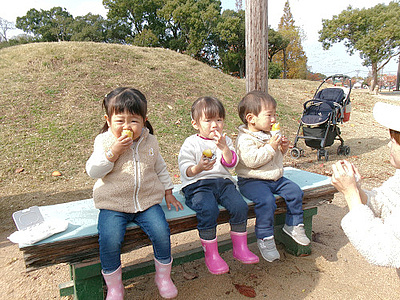 今月はいよいよ待ちかねていた「焼きいも」です。先月の遊ぼうの会で収穫したお芋などを、濡らした新聞紙やアルミホイルに包んで、かまどの火のそばに寄せて約20分で焼き芋が完成!