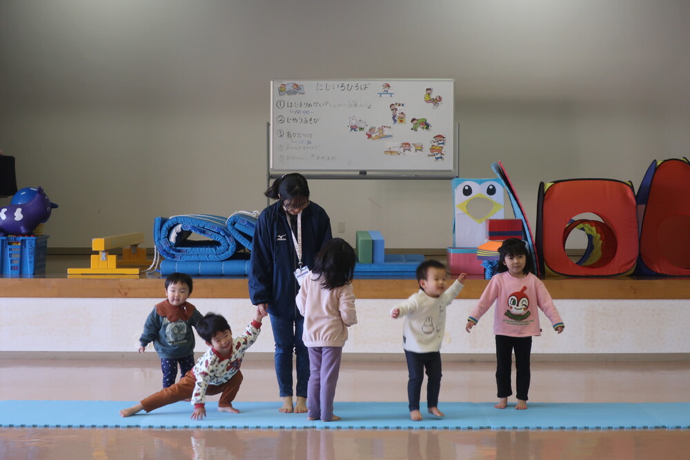 でこぼこマット、平均台、ブロック、トンネルくぐりなどに加え、日ごとに少し違った遊びを取り入れています。
