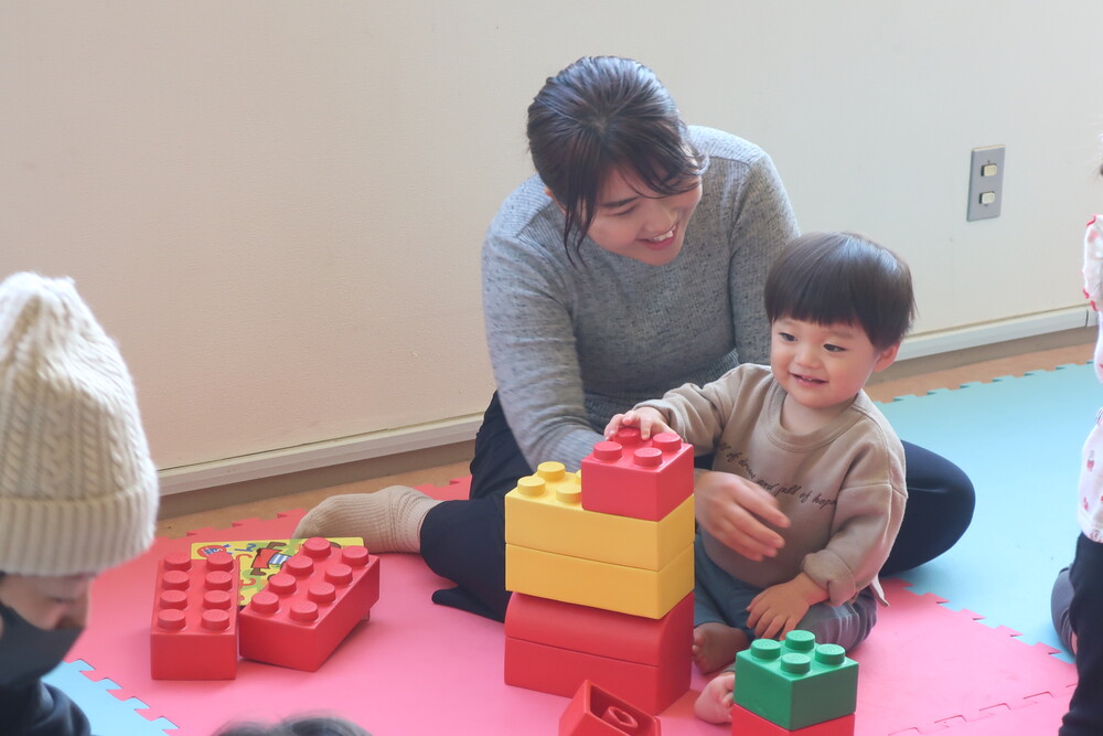 自由活動では、おかあさんに支えられながら小さなブロックを自分の身長よりも高く積もうと頑張っている子や、おともだち同士でどちらが高く積み上げられるか競い合う子どもたちの姿も見られました。