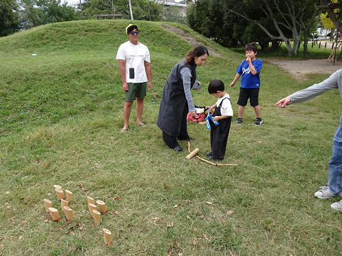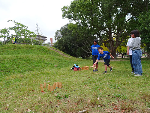 今回は同日に萩図書館まつりが開催され、いつものウッドデッキ前が使えなかったこともあり、萩わんぱーくでモルックを楽しみました。