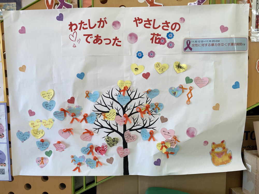 毎年11月に、「児童虐待防止運動」のシンボルであるオレンジリボンと、「女性に対する暴力をなくす運動」のシンボルであるパープルリボンを知ってもらうための活動を行っています。